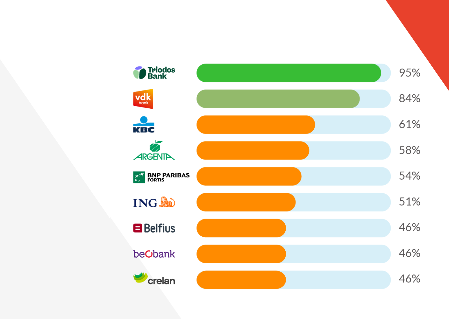 De kloof tussen grootbanken en duurzame banken is zo nog verder gegroeid. Zo blijft zelfs de best scorende grootbank, KBC, meer dan 20 procentpunten achter op de duurzame spelers Triodos Bank en vdk bank.